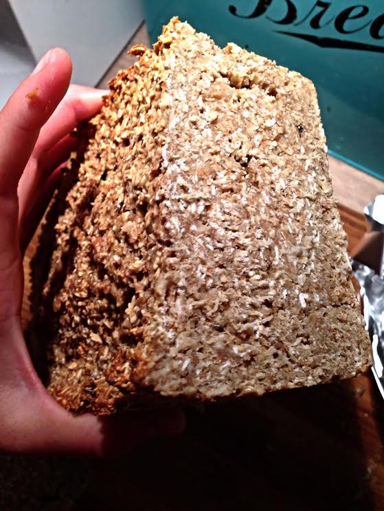 Det hvite her er altså knusk tørre havregryn. Brødet representerer den ekstreme motsetningen av oppskriftens intensjon. Jeg kan virkelig ikke begripe hvordan dette kunne bli så sinnsykt elendig. Tok faktisk til og med ekstra melk, så denne tørrheten må stamme fra en annen feilvurdering. I stedet for å gli ned i svelget som en fuktig svamp, vokste den underveis. For å kunne lide seg igjennom et stykke av det her må man fylle etter med væske i store mengder før man svelger. Om ikke, stopper det i svelget som en slags propp. Esingen trigget faktisk brekningsrefleksen uten at det var mulig å spy opp svineriet. Potensielt livsfarlig.